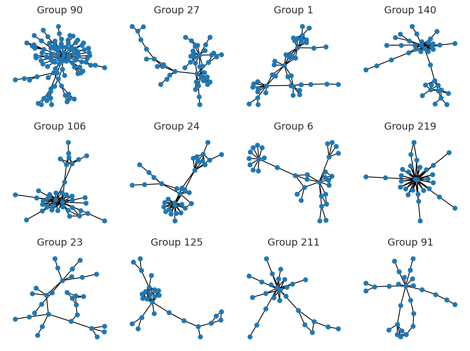 The simplest way to visualize the graph is to use the draw function from the networkx library. We will use the nx.draw function to visualize the graph. We will create a grid of subplots and visualize the top groups. Parameter seed is set to 42 to make the layout reproducible.