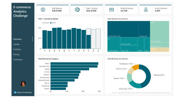 An interactive BI dashboard combining customer RFM segmentation, ABC/XYZ product analysis, and revenue forecasting using R models embedded in Power BI.