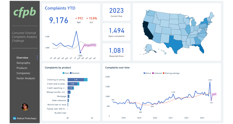 An interactive Power BI dashboard analyzing CFPB consumer complaints with trend forecasting, geographic and product breakdowns, and causal factor analysis using R models.